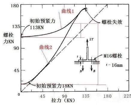 这种工况下,由于螺栓预紧力足够大,当连接面间承受压力,当工件受拉力时,工件连接面间的压力开始减小,当拉力达到一定程度时,连接面间压力为零,并开始相互分离,在此之前螺栓力变化缓慢,此后拉力、螺栓力、撬力形成杠杆平衡力系,螺栓力随着外力的增加而成比例的增加。这种情况下拉力和螺栓力的对应关系如图2-曲线1.