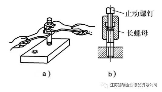 ②用长螺母拧入。如图2b)的所示,上面的螺钉用来阻止长螺母与双头螺柱之间的相对转动,然后扳动长螺母,双头螺柱即可拧入。松开止动螺钉,即可拆掉长螺母。