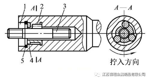 ③用专用工具拧入。图所示为双头螺柱拧入的专用工具。三个滚柱放在工具体空腔内,由限位套筒4确定其周向和轴向位置。限位套筒由凹槽挡圈固定,滚柱的松开和夹紧由工具体内腔曲线控制。滚柱应夹在螺栓的光杆部分,按图3所示箭头方向转动工具体即可拧入双头螺栓,反之则可松开螺栓。拆卸双头螺栓的工具,其凹槽曲线方向应和拧入工具的曲线方向相反。