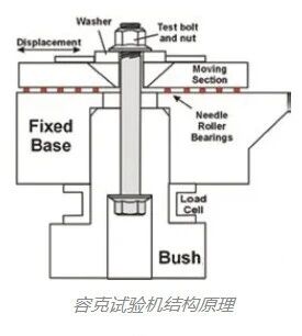 滚柱轴承用于消除移动和固定板之间摩擦的影响。当从螺母夹紧的移动板上施加横向运动时,压力传感器允许连续监测螺栓荷载。与冲击试验标准相比,这是一个主要优势,因为可以在试验期间测量预加载损失,并绘制预紧力与循环的关系图。Junker机器背后的想法是,凸轮产生的横向位移会导致接头发生摇摆(滑动),克服紧固件的摩擦力以后就会产生自松作用。