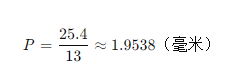 已知每英寸牙数 TPI = 13,根据上述公式可得牙距 P 为:
